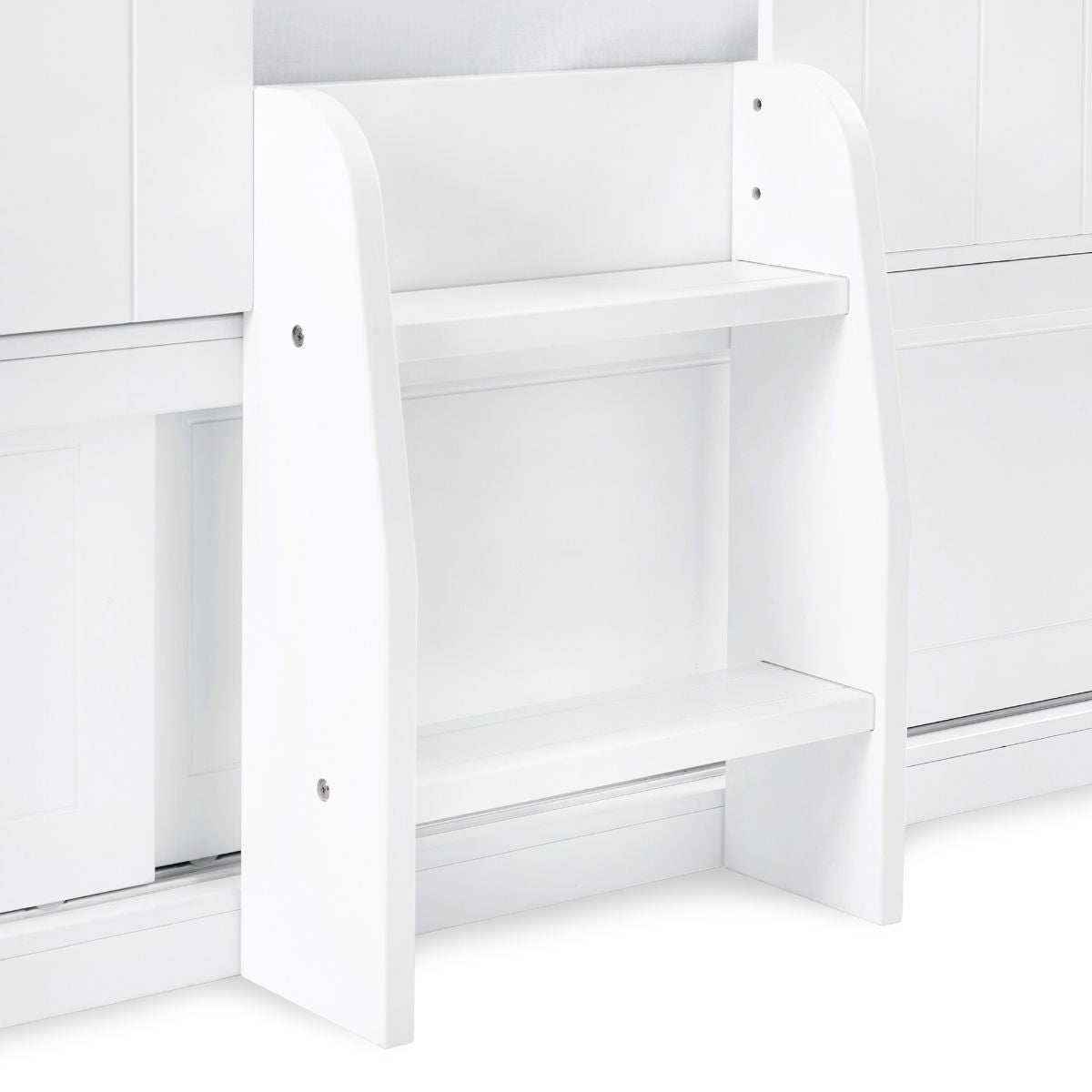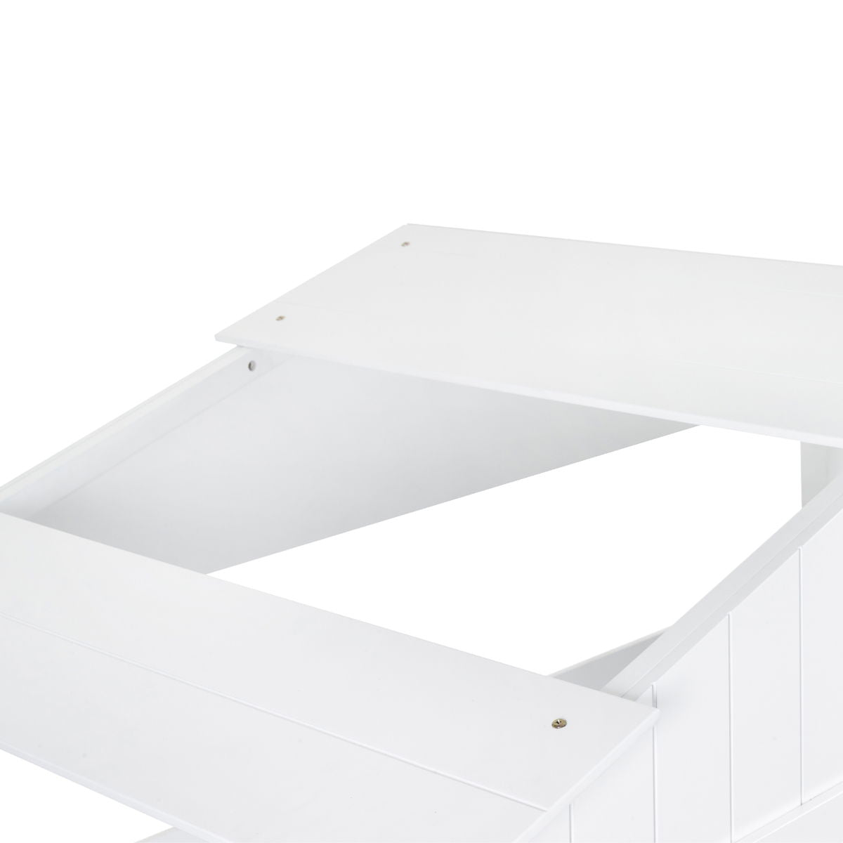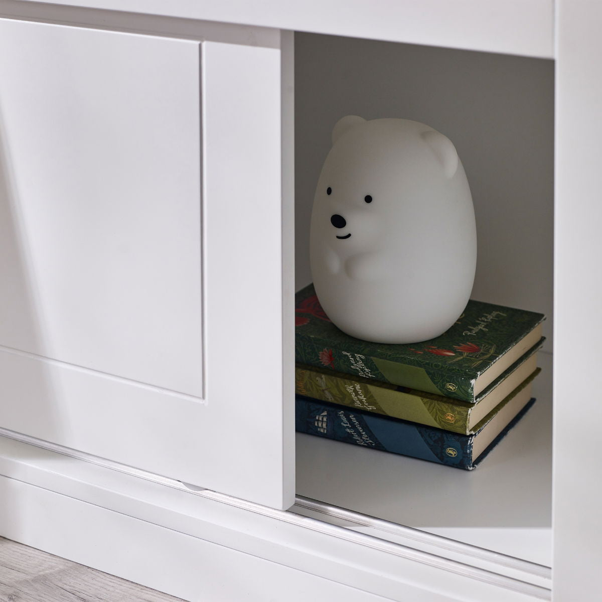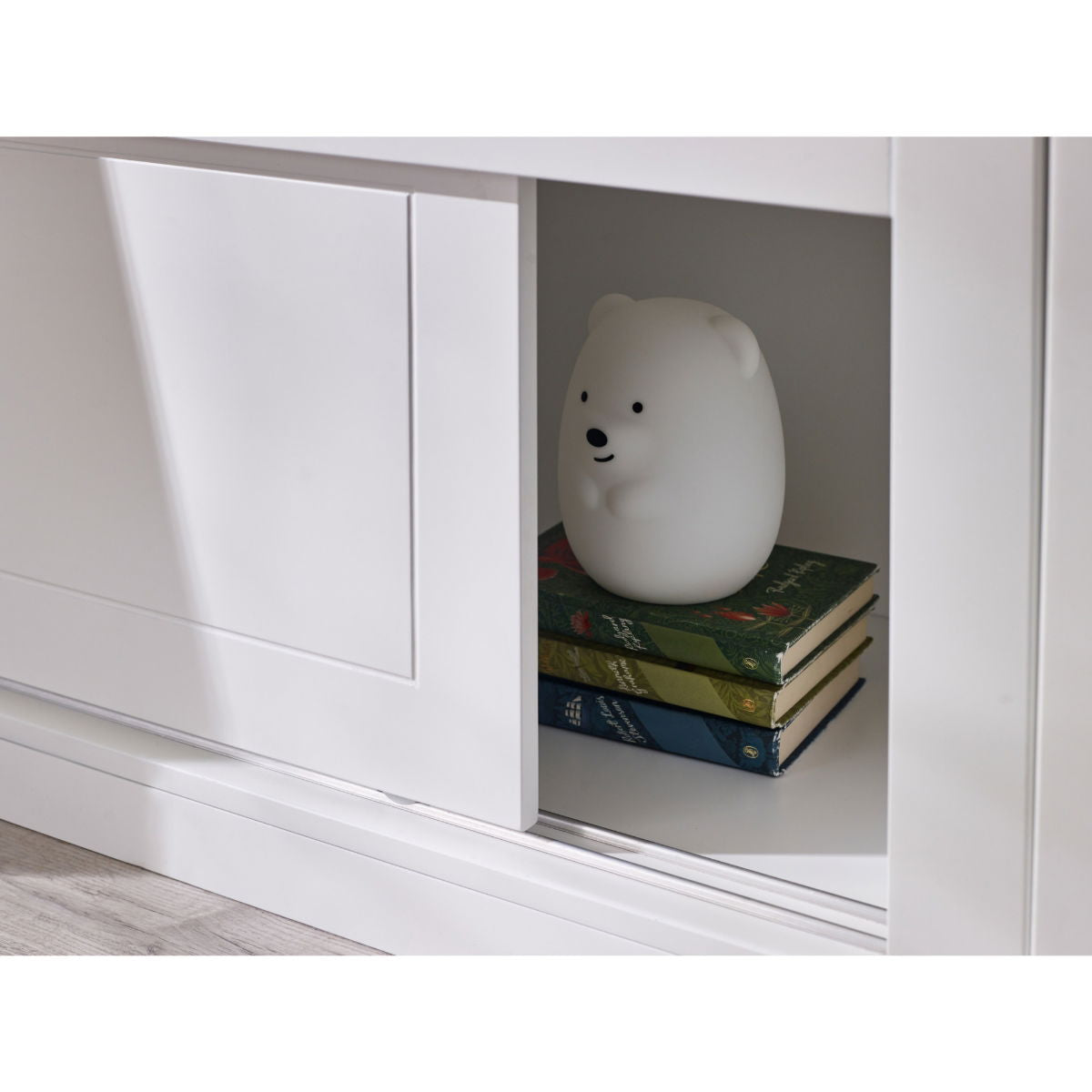 - Slide-door storage unit underneath provides great storage for toys and books.