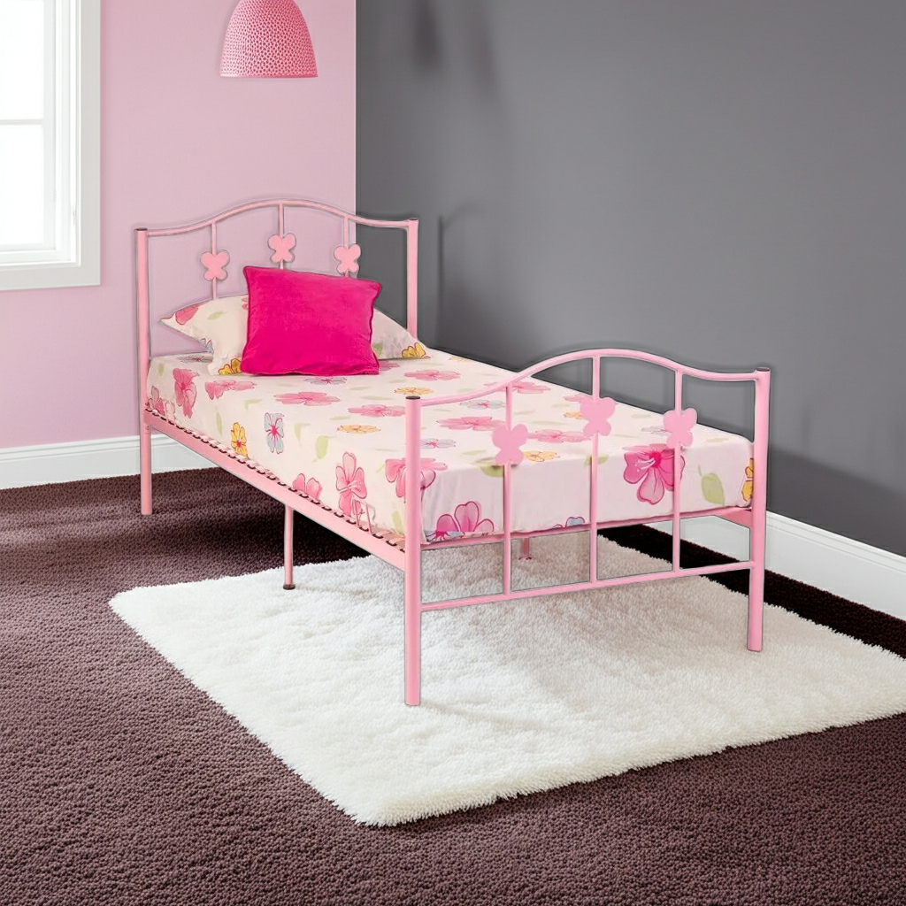 Bring a touch of fairy-tale magic to your bedroom with the Pink Metal Bed with Butterfly Detailing. Combining enchanting design with robust construction, this bed frame is perfect for creating a dreamy and delightful sleeping space.