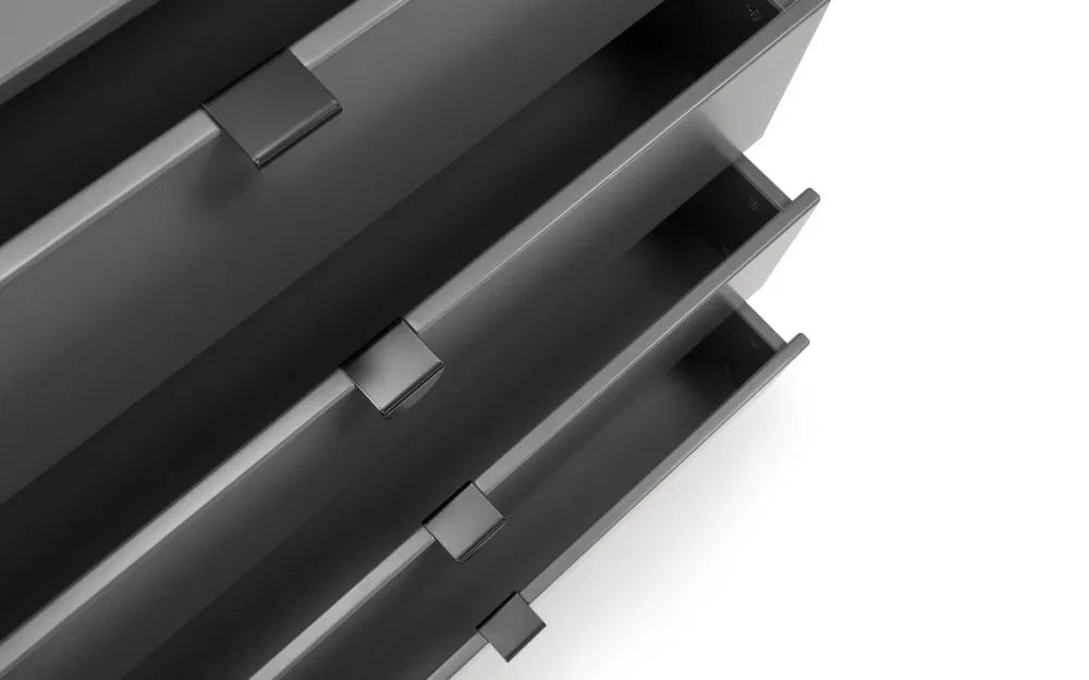 The Chloe Bedroom collection has a modern, retro style finished in a storm grey lacquer with satin black wooden legs and handles. The corners are rounded for a softer look, creating perfect balance between style and functionality. Featuring 4 large drawers, this chest is perfect for neatly storing your clothes.