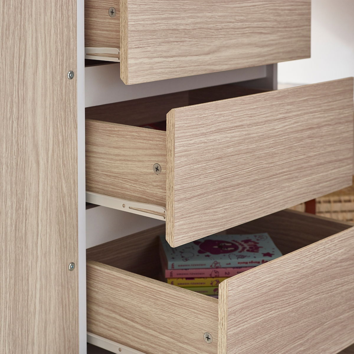 Crafted with precision and finished in a tasteful white and woodgrain effect, the Ocean Highsleeper boasts a versatile design that maximises every inch of space. This highsleeper features a practical desk that provides a dedicated workspace for homework or creative endeavours, with three convenient pull-out storage drawers that prevent cluttering and keeps essential items within arms reach. The built-in shelving units are ideal for showcasing items or organising books, and the one-door wardrobe offers a discreet and space-efficient solution for clothes. The glow-in-the-dark steps are a perfect addition - not only do they add a playful touch, but they enhance visibility during the night for your younger ones.