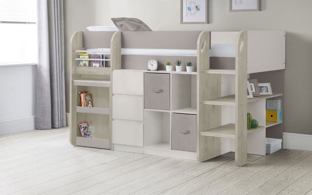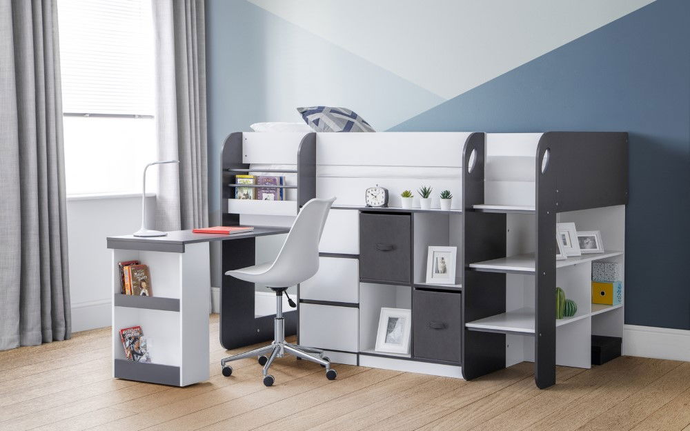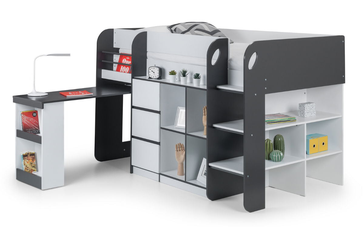 Offering a compact, space saving design, the Saturn Midsleeper features a bookcase, 3 drawer chest, and a cube bookcase saving floor space for toys and more. Finished in a modern charcoal grey and white, this midsleeper is perfect for a wide range of childrens bedroom décor. Crafted from sturdy particleboard, this bed has a wooden slatted base and fits a UK single mattress.