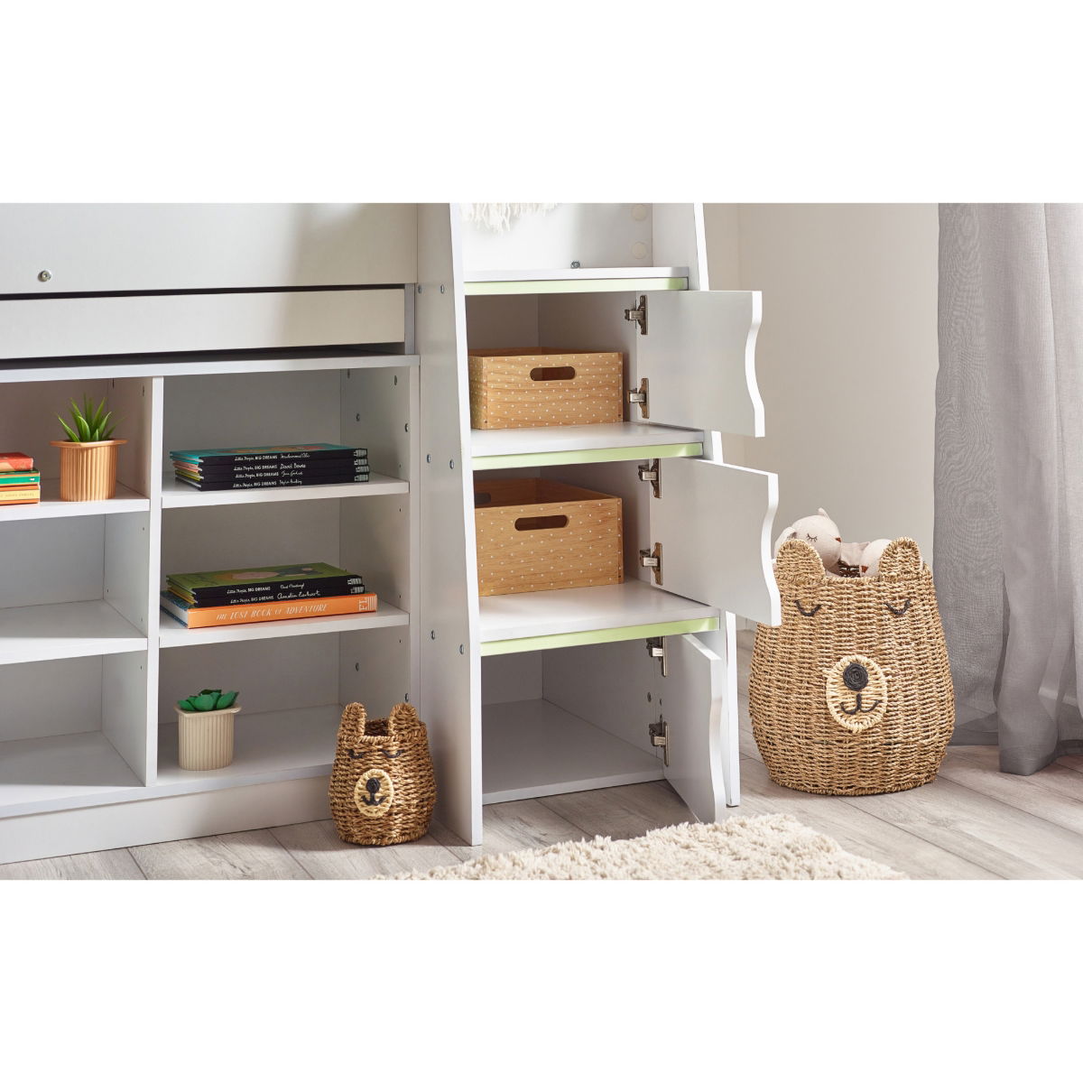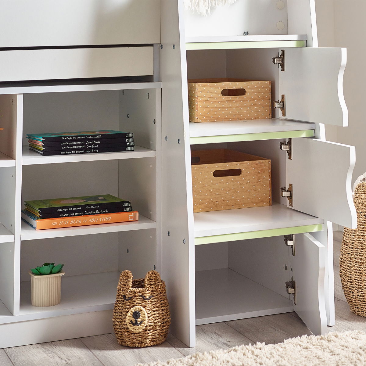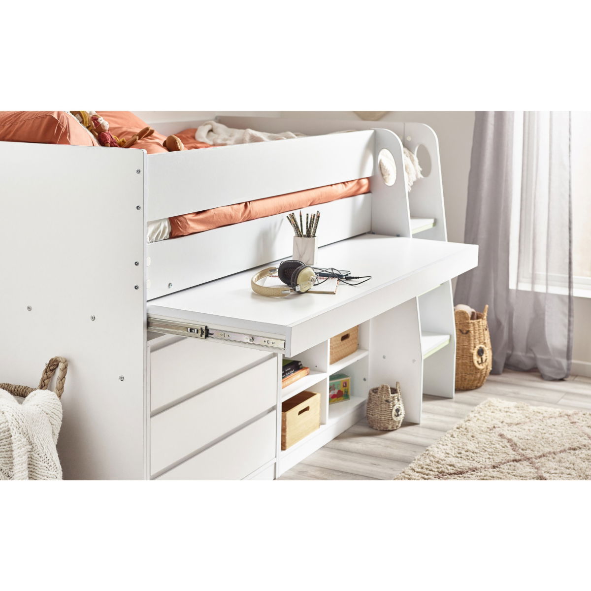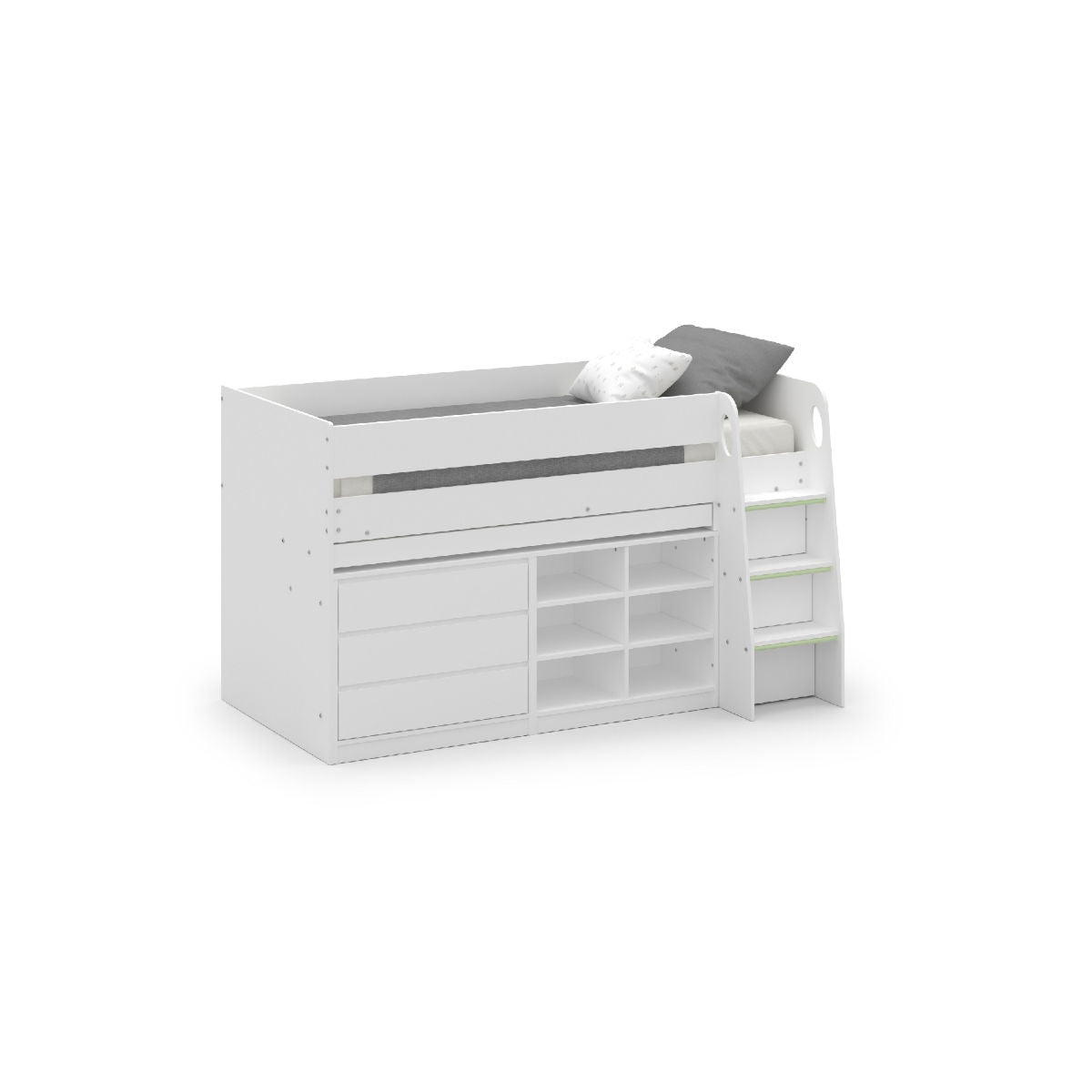 - Space-Saving Design: Combines a bed with storage and play space underneath. Sturdy Construction: Made from high-quality materials for durability. Safe and Secure: Features safety rails to prevent falls. Stylish Look: Sleek white finish that complements any bedroom decor. Easy Access: Ladder included for easy access to the bed.