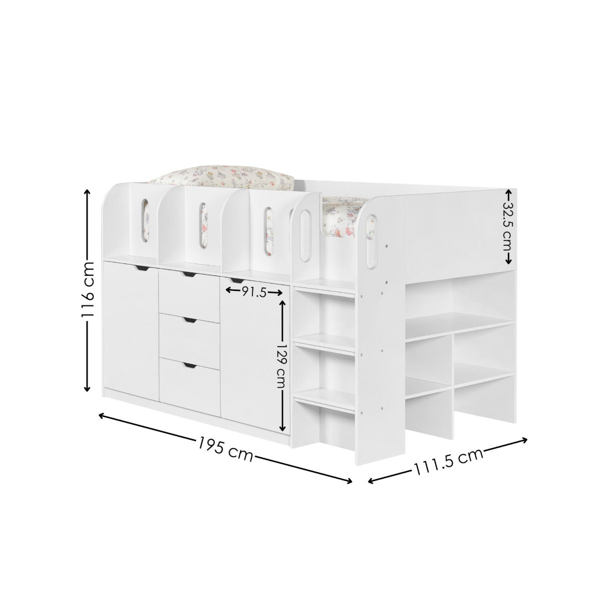 - BUILT IN STORAGE: The space beneath the bed is cleverly designed to include a desk and shelves, creating a practical area for homework, creative play, and everyday organisation.